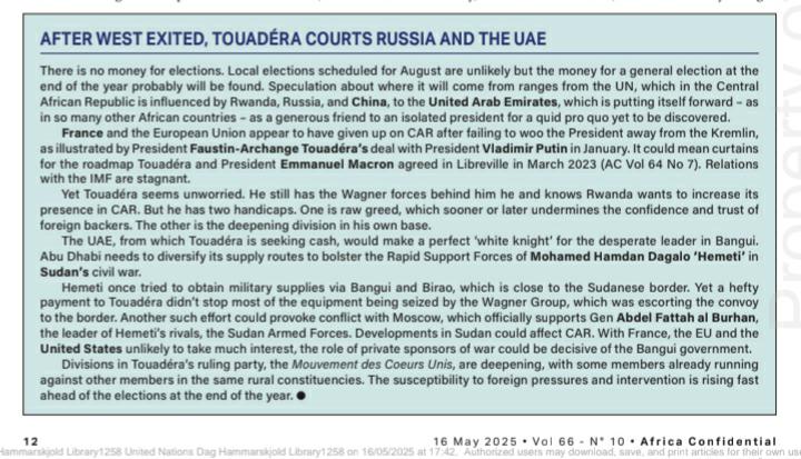 تشير مصادر مطلعة إلى أن تزايد اعتماد حكومة بانغي على التمويلات الخاصة – خصوصًا من قوى خارجية – يجعل مستقبلها رهينًا بحسابات الصراع في السودان. ويأتي ذلك في وقت تسعى فيه الإمارات لتثبيت نفوذها في مناطق عبور حساسة، بالتوازي مع استمرار الاتهامات الرسمية السودانية لها بدعم حميدتي عسكريًا.