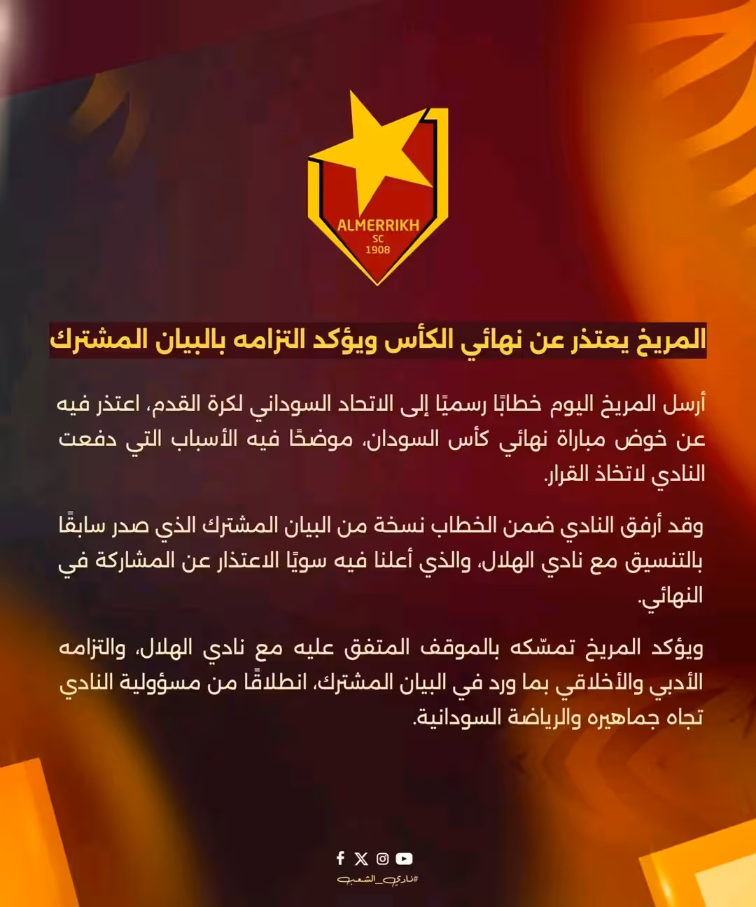 وأوضح المريخ أن قراره يأتي انسجامًا مع البيان الذي وقّعه الناديان في وقت سابق، والذي تضمّن رفض خوض النهائي، احتجاجًا على ما وصفاه بعدم العدالة في إدارة النشاط الرياضي.
