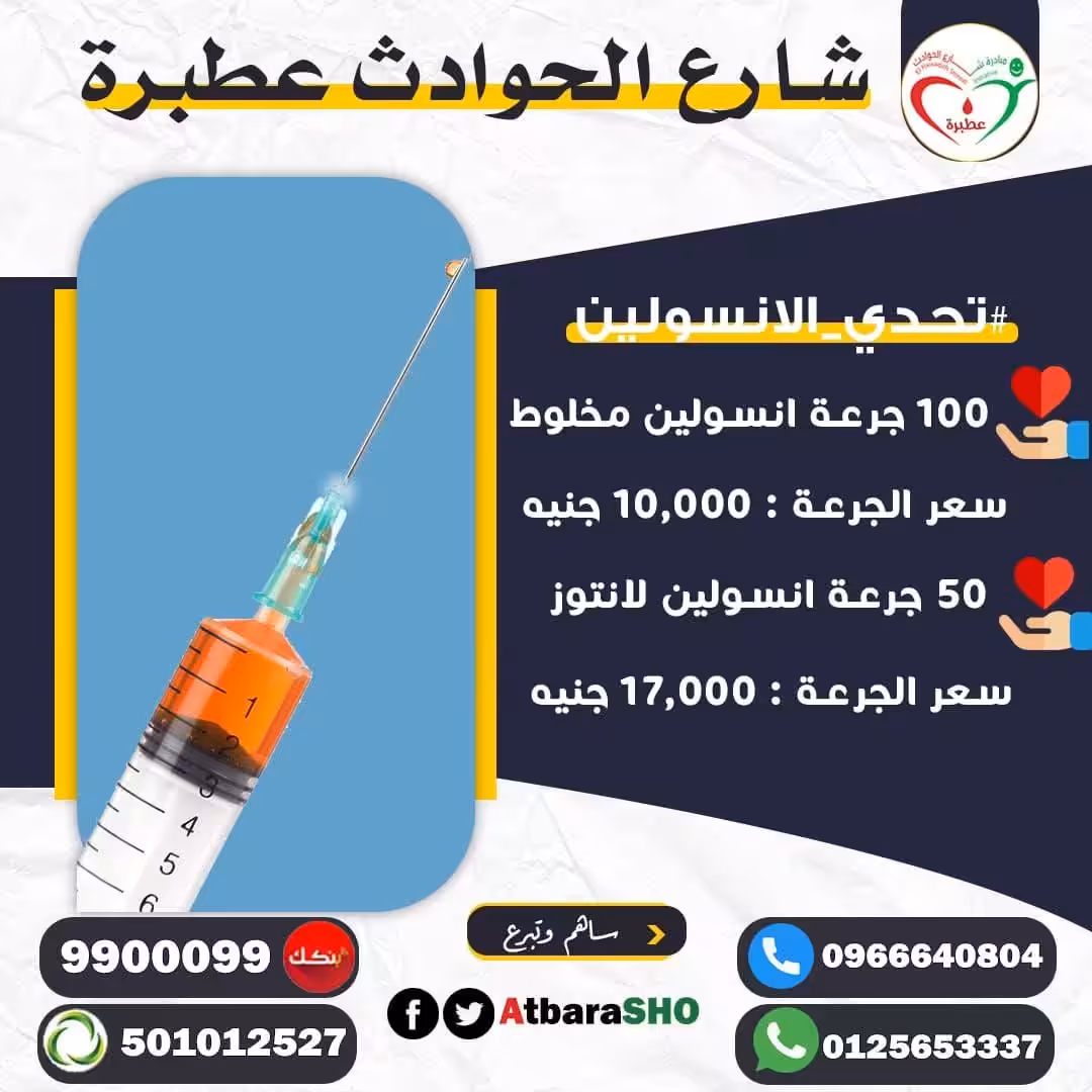 تُطلق منظمة شارع الحوادث عطبرة حملة إنسانية عاجلة تحت عنوان #تحدي_الأنسولين، للوقوف مع مرضى السكري في واحدة من أحلك لحظاتهم، حيث الدواء مفقود والحياة على المحك.