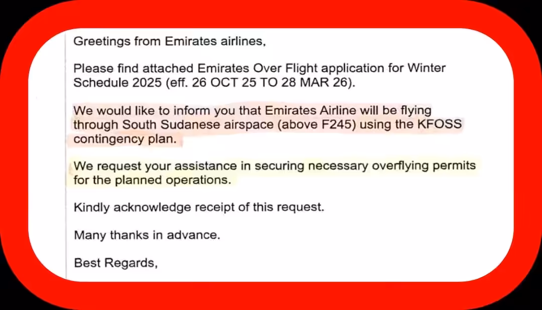 في تطور غير مسبوق، تقدمت شركة طيران الإمارات بطلب رسمي إلى سلطة الطيران المدني السوداني للحصول على تصريح عبور عبر المجال الجوي للسودان في طريقها إلى جنوب السودان، وذلك وفق خطة الطوارئ المعروفة بـ(KFOSs) وعبر المسار الجوي (F245).