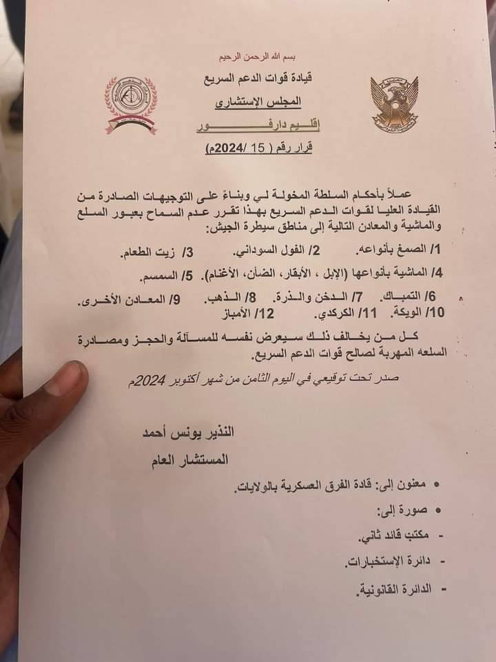 وأصدر المستشار العام لـ«قوات الدعم السريع» النذير يونس أحمد، قراراً حَظَر بموجبه عبور عدد من السلع إلى مناطق سيطرة الجيش السوداني، وتتضمن: «الصمغ بأنواعه، والفول السوداني، وزيت الطعام، والماشية بأنواعها (الأبقار، الإبل، الضأن، الماعز)، والسمسم، والتمباك (يُشبه القات اليمني)، والدخن والذرة، والذهب، والمعادن الأخرى، والكركديه، والأمباز (علف حيوانات)، والبامية المجففة (الويكة)».