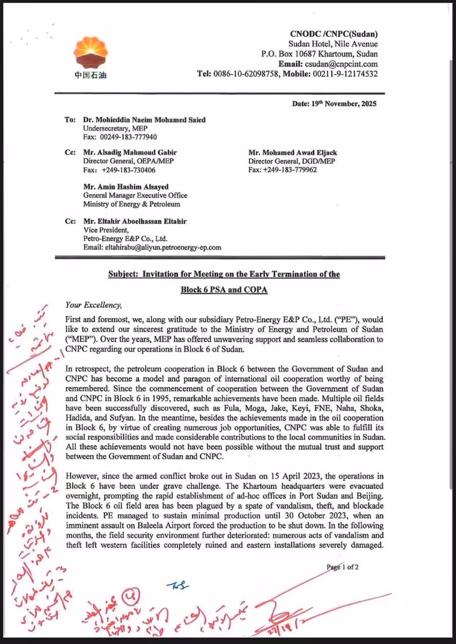 ودعت شركة البترول الوطنية الصينية (CNPC) الحكومة السودانية إلى اجتماع عاجل في جوبا قبل نهاية ديسمبر لمناقشة الإنهاء المبكر لاتفاقية تقاسم الإنتاج، معربة عن أسفها للانسحاب القسري ورغبتها في العودة فور استقرار الأوضاع الأمنية.