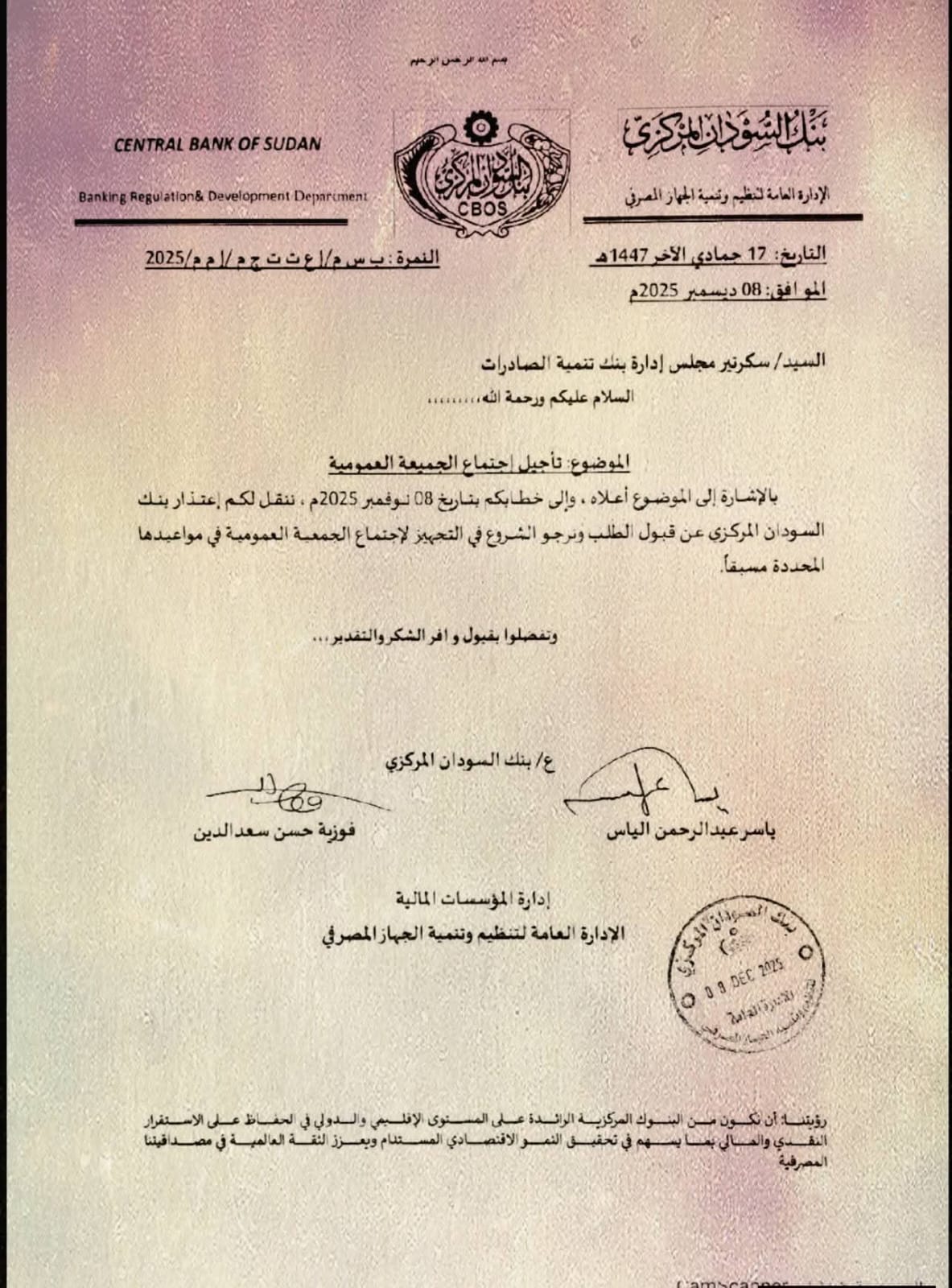 في المقابل، أبدت محافظ بنك السودان المركزي، آمنة ميرغني، بدعم من وزير المالية جبريل إبراهيم، تمسكاً قاطعاً بعقد الجمعية في موعدها المقرر في 25 فبراير، رافضةً التهديدات التي لوحت بأبعاد “جهوية” للسيطرة على البنك بعد تصريحات منسوبة للسيسي وصف فيها البنك بأنه “حق لأبناء الغرب”.