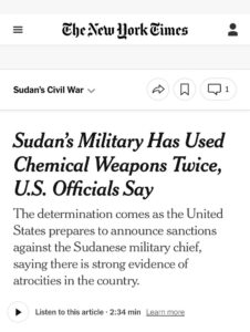 إن استخدام الأسلحة الكيميائية يتعدى حدودا أبعد في الحرب بين الجيش السوداني والدعم السريع، حليفها السابق. وفقًا للعديد من الإحصائيات، فقد خلقت الحرب أسوأ أزمة إنسانية في العالم، حيث قُتل ما يصل إلى 150،000 شخص، ونزح أكثر من 11 مليون شخص، والآن أسوأ مجاعة في العالم منذ عقود.