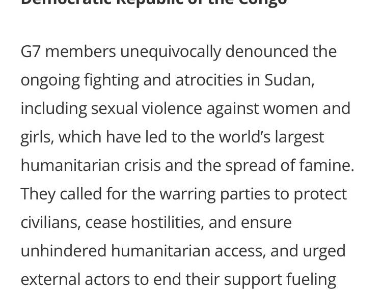 ترجمة ـ شبكة_الخبر ـ أدانت مجموعة السبع وبشكل لا لبس فيه القتال الدائر والفظائع التي تتكشف فصولها في السودان، بما ذلك العنف الجنسي ضد النساء والفتيات، مما أدى إلى أكبر أزمة إنسانية في العالم وإلى انتشار المجاعة.