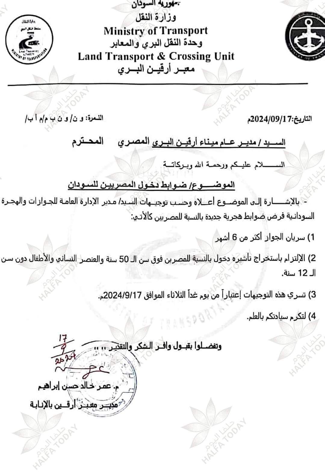 أخبارسلايدرسياسي السودان :ضوابط جديدة لدخول المصريين عبر معبر أرقين الخبر17 سبتمبر 2024 - 2:52 مساءً نسخة من القرار خاص شبكة الخبر متابعات- شبكة الخبر أصدرت وزارة النقل في السودان، ضوابط لدخول المصريين للسودان، عبر معبر أرقين البري الحدودي. الوسوممعبر _أرقين وزارة_النقل_السودان الخبر17 سبتمبر 2024 - 2:52 مساءً
