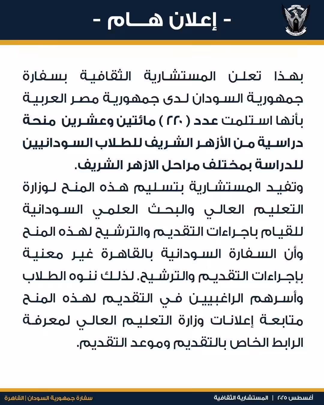 220 منحة أزهرية جديدة لطلاب السودان