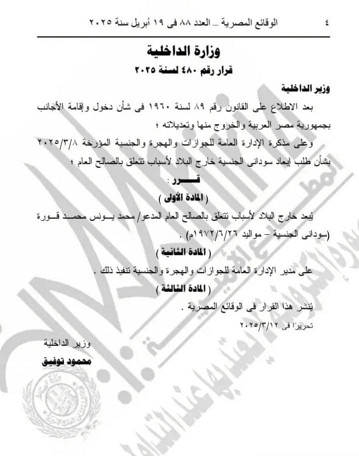 الداخلية المصرية تصدر قراراً بإبعاد الموطن السوداني محمد يونس قورة